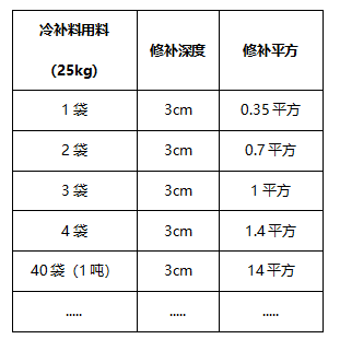 (計(jì)算公式:坑槽表面積(平方)*坑槽深度(米)*2.37(密度)=瀝青冷補(bǔ)料用量(噸))以一袋冷補(bǔ)料25kg,修補(bǔ)深度3cm為例,一袋預(yù)計(jì)可鋪0.35平方;以此類推: