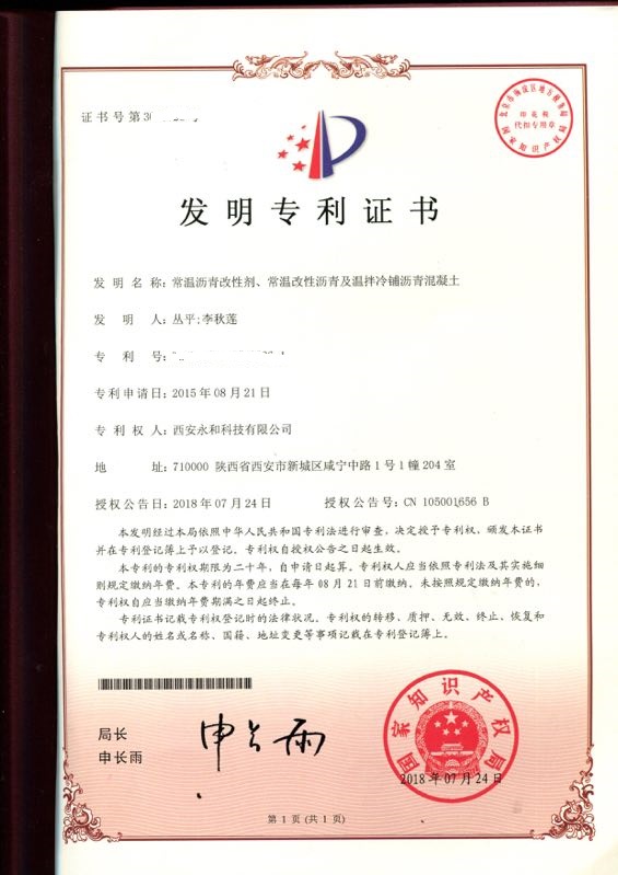 今年8月,我公司“常溫瀝青改性劑、常溫改性瀝青及溫拌冷鋪瀝青混凝土”發(fā)明通過(guò)國(guó)家知識(shí)產(chǎn)權(quán)局審查,授予專利權(quán),并頒發(fā)發(fā)明專利證書。
